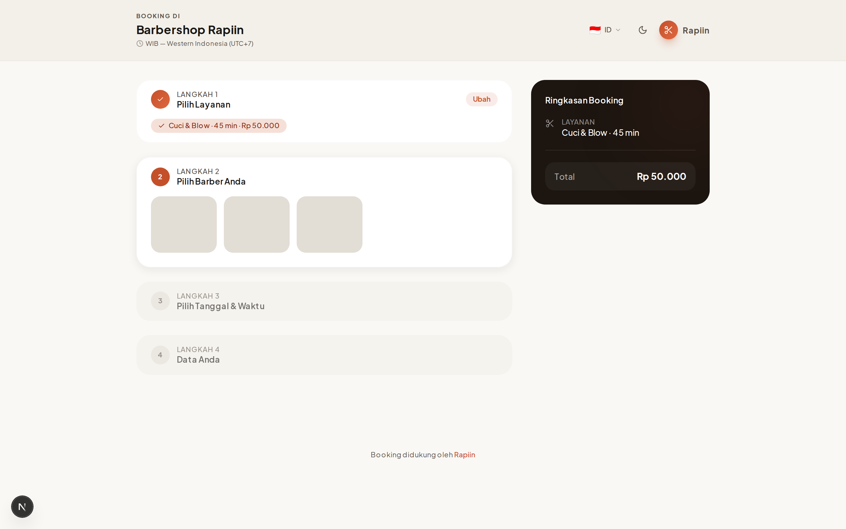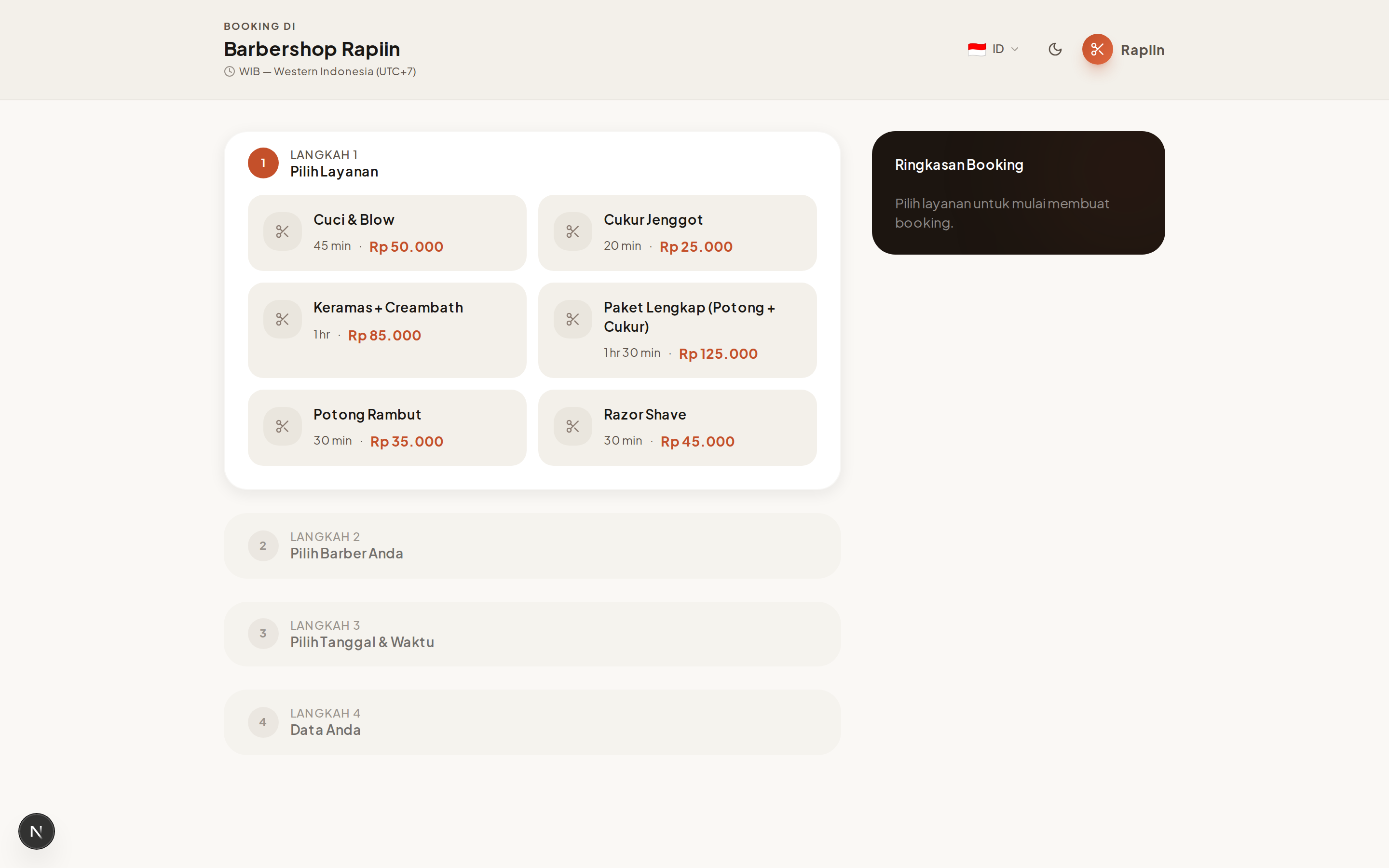 Buka tautan booking outlet (contoh: https://rapiin.web.id/nama-outlet). Pilih layanan yang ingin Anda pesan.