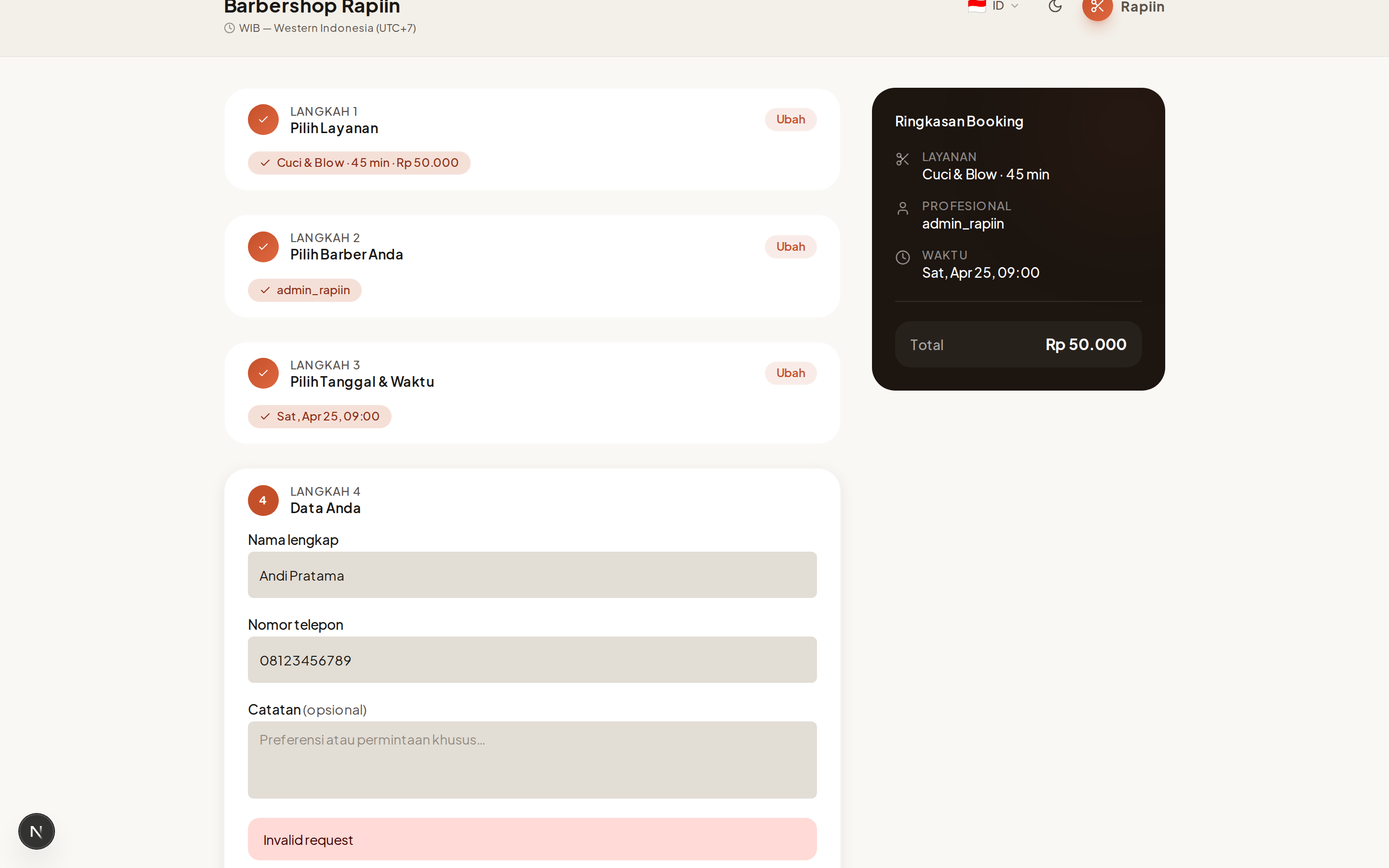 Masukkan nama lengkap dan nomor telepon Anda. Data ini digunakan oleh studio untuk konfirmasi booking.