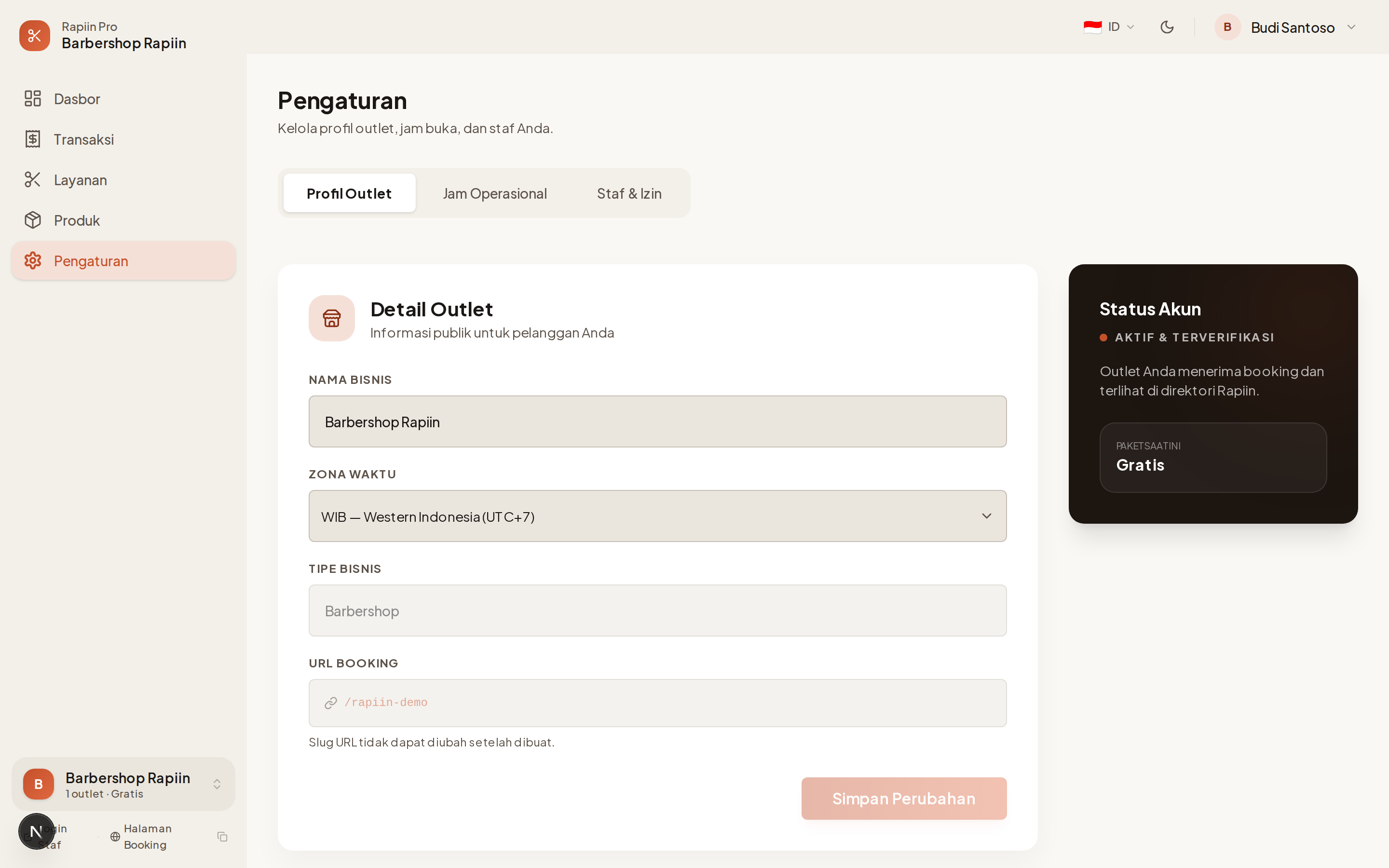 Tab Profil di halaman Pengaturan memungkinkan Anda mengubah identitas outlet — nama bisnis, jenis usaha, dan zona waktu yang digunakan untuk perhitungan slot booking.