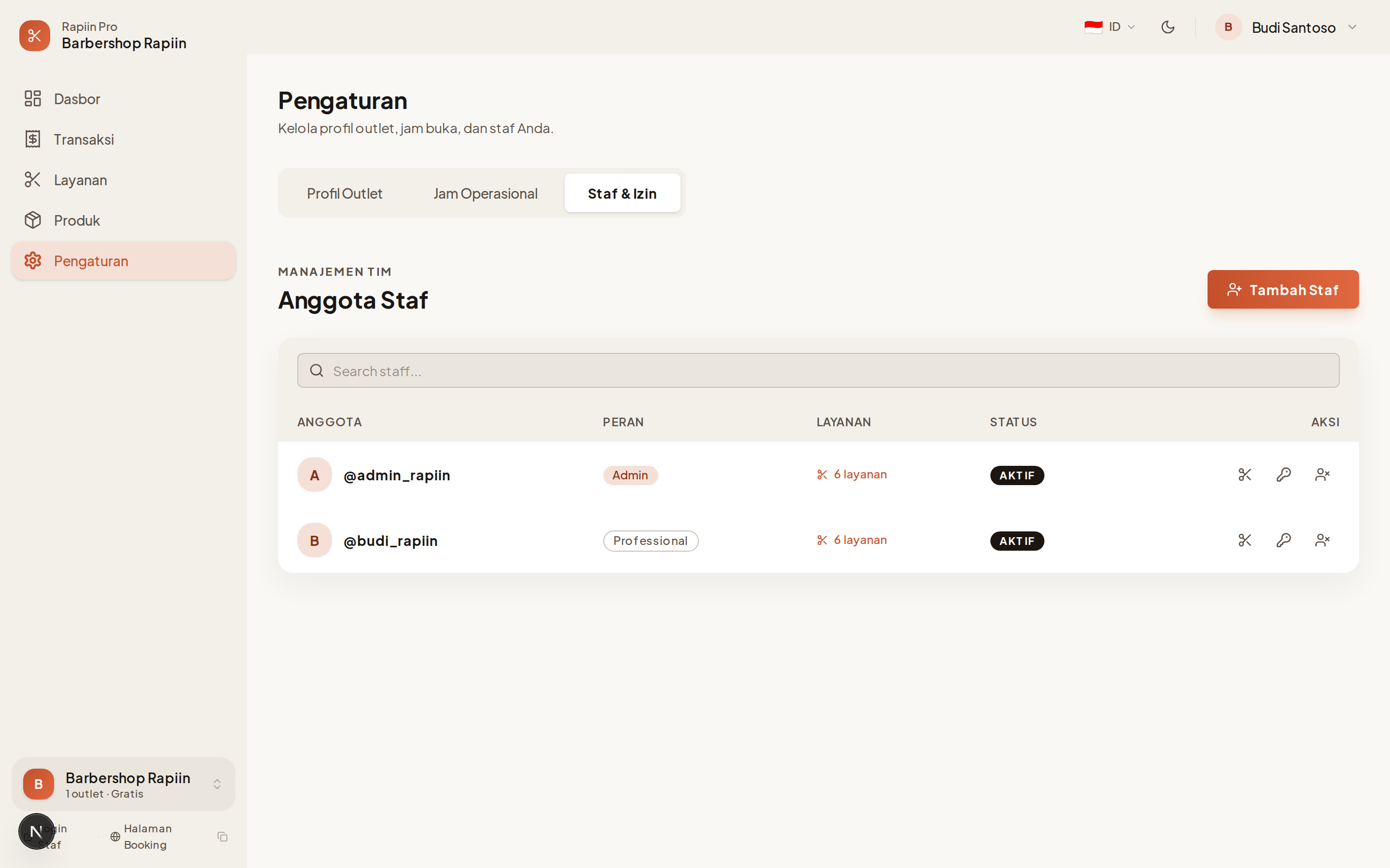 Tab Staff menampilkan semua anggota tim outlet Anda. Dari sini Anda bisa menambah staff baru, mengubah peran, mengatur layanan yang bisa dikerjakan, dan menghapus staff yang sudah tidak aktif.
